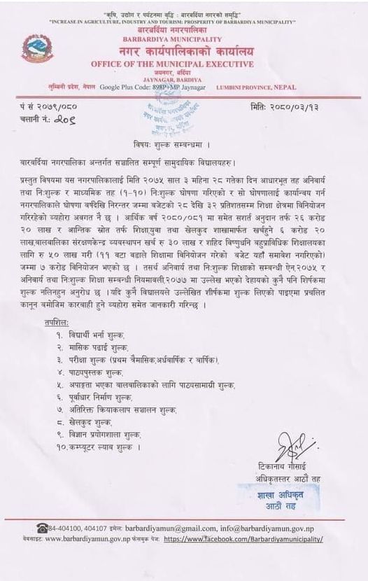 बारबर्दिया नगरपालिकाले नगरभित्रका सम्पुर्ण सामुदायिक विद्यालयलाई आफुखुशी कुनै पनि शुल्क नलिन एक सुचना निकालेर निर्देशन दिएको छ । आधारभूत तह अनिवार्य तथा निःशुल्क र माध्यमिक तह (१–१० कक्षासम्म) निःशुल्क घोषणा गरिएकोले सो घोषणा कार्यान्वयन गर्नको लागि पालिकाले सुचना निकालेर कुनै पनि शुल्क नलिन निर्देशन दिएको हो । अनिवार्य तथा निःशुल्क शिक्षा सम्बन्धी ऐन, २०७५ र अनिवार्य तथा निःशुल्क शिक्षा सम्बन्धी नियमावली, २०७७ मा उल्लेख भए बमोजीम विद्यार्थी भर्ना शुल्क, मासिक पढाइ शुल्क, परीक्षा शुल्क, पाठ्य पुस्तक शुल्क नलिन सुचनामा उल्लेख गरिएको छ ।