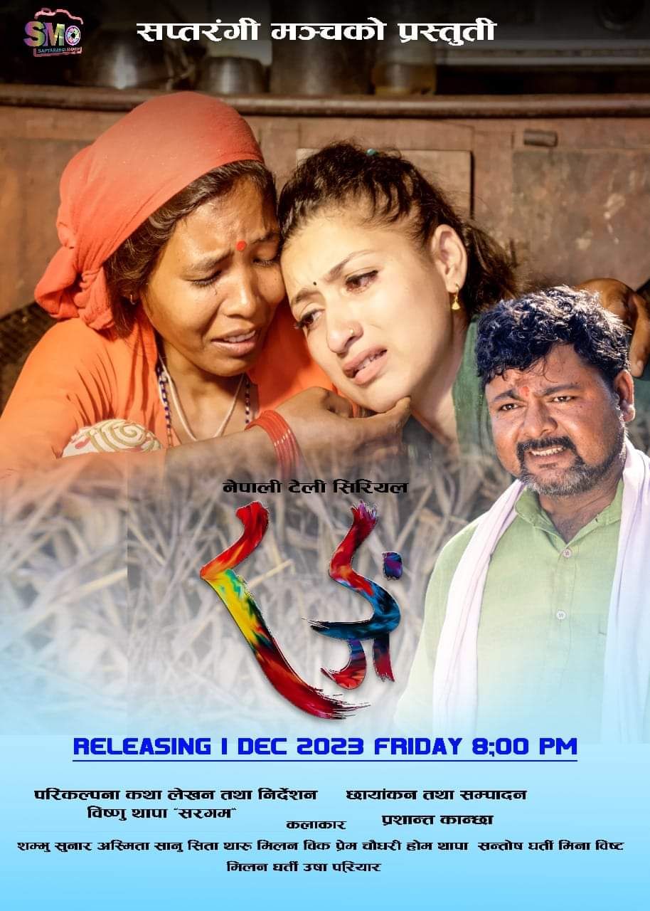 सप्तरङ्गी मञ्च बर्दिया द्धारा निर्माण गरिएको नेपाली टेली सिरियल “रङ्ग” शुक्रबार देखी प्रसारणमा आउने भएको छ । लामो समय देखी प्रतिक्षा गरेको टेली सिरियलको निर्माण टिमले प्रसारणको मिति तय गरे सँगै प्रतिक्षारत सिरियल पारखीहरुले “रङ्ग” टेली सिरियल नियमति हेर्न पाउने भएका छन् । बर्दियाली कलाकार तथा सप्तरङ्गी मञ्च बर्दियाका अध्यक्ष बिष्णु थापा सरगमको परिकल्पना, कथा लेखन तथा निर्देशनमा निर्माण भएको टेली सिरियल “रङ्ग”को मंसिर १५ गते शुक्रबार राती ८ः०० बजे सप्तरङ्गी मञ्च युटुब च्यानलबाट पहिलो भाग प्रसारणमा ल्याईने छ । शुक्रबार राती पहिलो भागको प्रसारण सँगै सिरियल हरेक हप्ता सोही समयमा सोही युटुब च्यानलबाट नियमित प्रसारणमा आउने निर्माण टिमले जनाएको छ ।