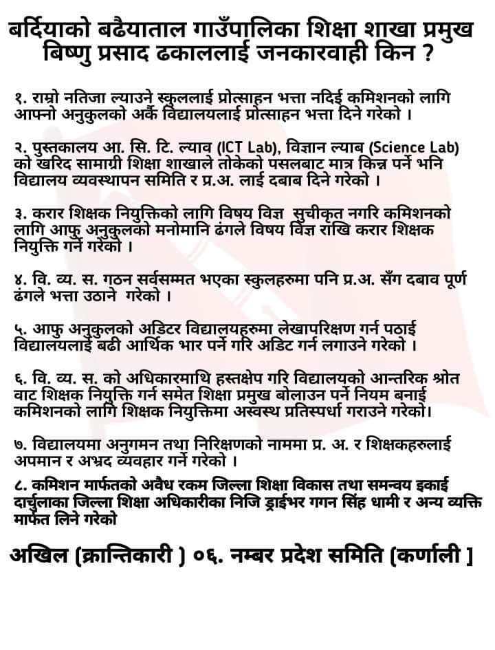 बर्दियाको बढैयाताल गाउँपालिका शिक्षा शाखा प्रमुखलाई अनेरास्ववियु (क्रान्तिकारी) कर्णाली प्रदेशद्धारा कार्रवाही गरिएको छ । नगरको शैक्षिक कार्यमा भ्रष्टाचार र अनियमितता गरेको भन्दै अखिल नेपाल राष्ट्रिय स्वतन्त्र विद्यार्थी युनियन (क्रान्तिकारी) कर्णालीले कालोमोसो दलेको हो । अनेरास्ववियु (क्रान्तिकारी) कर्णाली प्रदेश इन्चार्ज हरि विष्टले बढै्याताल गाउँपालिका शिक्षा प्रमुख विष्णु प्रसाद ढकाललाई कारवाही गर्नुको कारणसहितको पत्र सार्वजनिक गर्नुभएको छ । पत्रमा उल्लेख भए अनुसार राम्रो नतिजा ल्याउने स्कुललाई प्रोत्साहन भत्ता नदिई कमिशनको लागि आफ्नो अनुकुलको अर्कै विद्यालयलाई प्रोत्साहन भत्ता दिने गरेको, पुस्तकालय आई सि.टि ल्याव, विज्ञान ल्याबको खरिद सामाग्रि शिक्षा शाखाले तोकेको पसलबाट मात्र किन्न पर्ने भनि विद्यालय व्यवस्थापन समितिलाई दबाब दिने गरेको, करार शिक्षक निउक्तिको लागि विषय विज्ञ सुचीकृत नगरि कमिशनको लागि आफु अनुकुलको मनोमानि ढंगले विषय विज्ञ राखि करार शिक्षक नियुक्ति गर्ने गरेको अरोप शिक्षा शाखा प्रमुख ढकाललाई लगाएको छ । त्यस्तै आफु अनुकुलको अडिटर विद्यालयहरुमा लेखापरिक्षण गर्न पठाई विद्यालयलाई बढि आर्थिक भार पर्ने गरि अडिट गर्न लगाउने गरेकोले कालोमोसो दलिएको संगठनले बताएको छ । साथै विद्यालय व्यवस्थापन समितीको अधिकारमाथि हस्तक्षेप गरि, विद्यालयको आन्तरिक श्रोतबाट शिक्षक नियुक्ति गर्न समेत शिक्षा प्रमुख बोलाउन पर्ने नियम बनाई, कमिशनको लागि शिक्षक नियुक्तिमा अस्वछ प्रतिस्पर्धा गराउने गरेको, विद्यालयमा अनुगमन तथा निरिक्षणको नाममा प्र.अ. र शिक्षकहरुलाई अपमान र अभ्रद व्यवहार गर्ने गरेको र कमिशन मार्फतको अवैध रकम जिल्ला शिक्षा विकाश तथा समन्वय इकाई दार्चुलाका जिल्ला शिक्षा अधिकारीका निजि ड्राईभर गगन सिह धामि र अन्य व्याक्ति मार्फत लिने गरेकोले कालोमोसो दलिएको समेत संगठनको आरोप छ । बढै्याताल गाउँपालिका शिक्षा विष्णु प्रसाद ढकाललाई कारवाही गरिएको क्रान्तिकारी बर्दिया जिल्ला इन्चार्ज विष्णु परियार (शक्ति)ले जानकारी दिनुभएको छ । यता बढै्याताल गाउँपालिकाका प्रमुख प्रसासकिय अधिकृत अर्जन सुवेदीले शिक्षा शाखा प्रमुख ढकाललाई खजुराबाट कार्यलयमा आउदैगर्दा बाटोमा नै अभद्र क्रियाकलाप गरिएको बताउनुभयो । उहाँले सो घटनालाई लिएर कानुनी प्रक्रिया हुदाहुदै पनि सिद्धान्त विपरीत राष्ट्रसेवक कर्मचारीलाई दुर्व्यवहारले ध्यानाकर्षण भएको बताउनुभयो ।